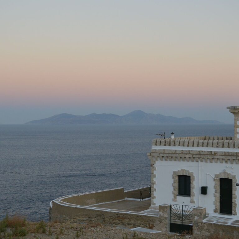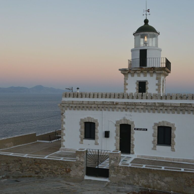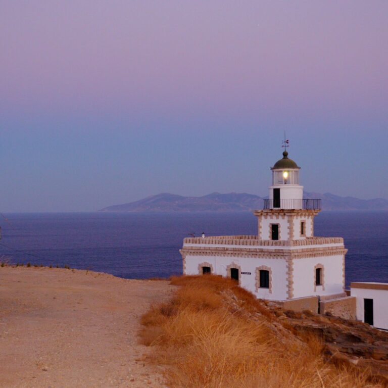 Faros at Spathi, the lighthouse that adorns the south side of Serifos was built in 1901. It is automatic, with luminosity of 18 nautical miles. It’s a beautiful stony building, on the steep rocks of cape Spathi, 65 meters above sea level. The tower is reminiscent of another era. The stone around the windows and on the corners of the walls make it one of the most beautiful lighthouses in the Cyclades. Its balcony overlooks the blue sea of Aegean, and the view is spectacular all day long, more so on the sunset. The old cobblestone path that starts from the lighthouse leads to the sea and that is where the Lighthouse Keepers of old would arrive by boat and go uphill.